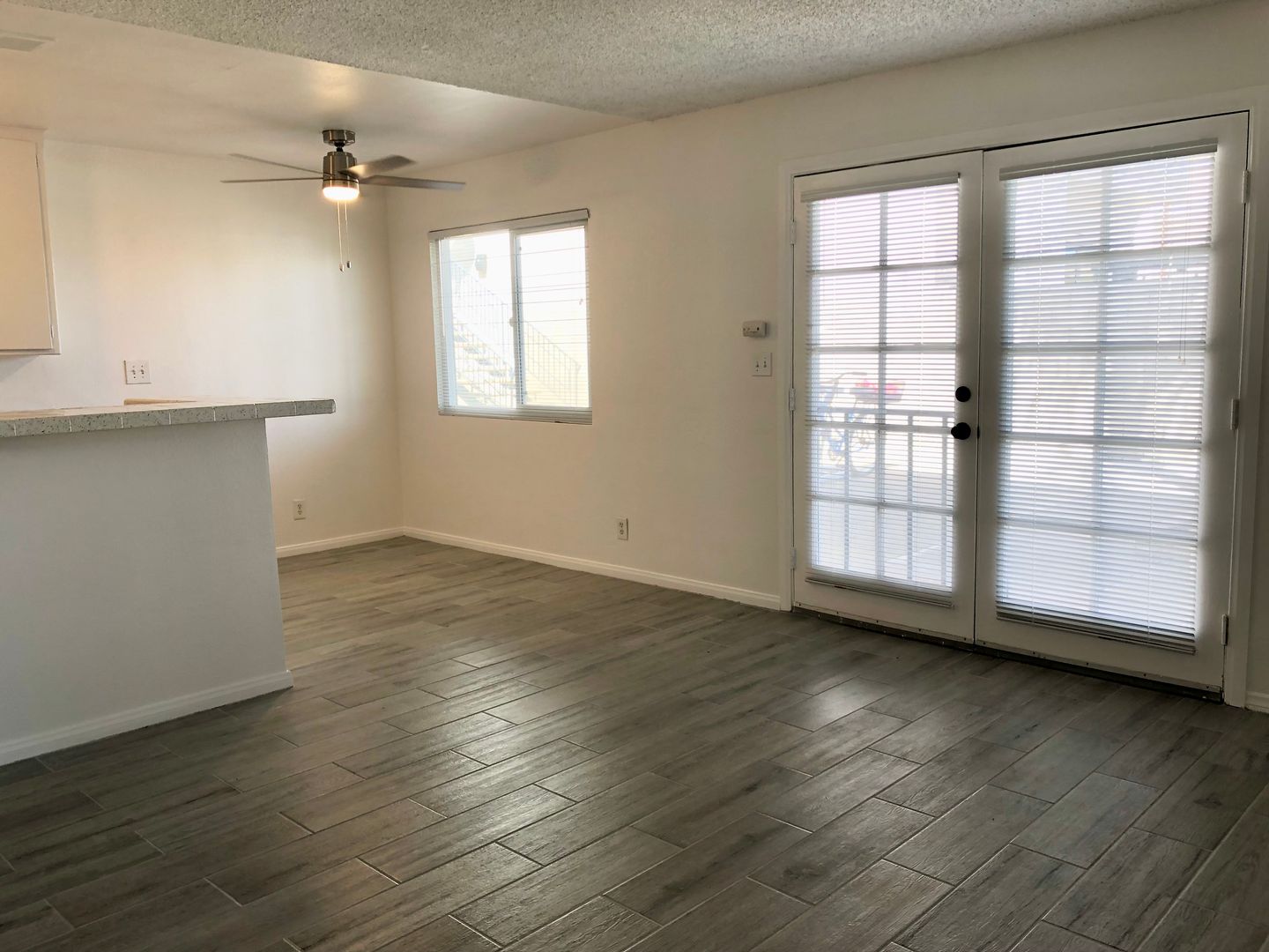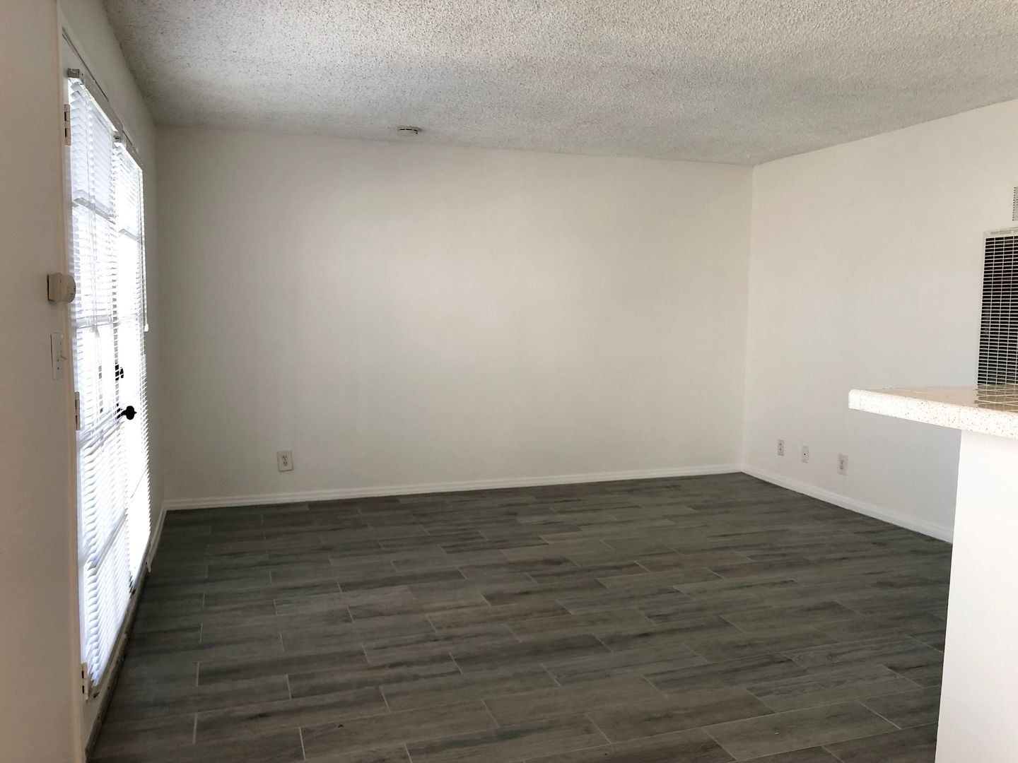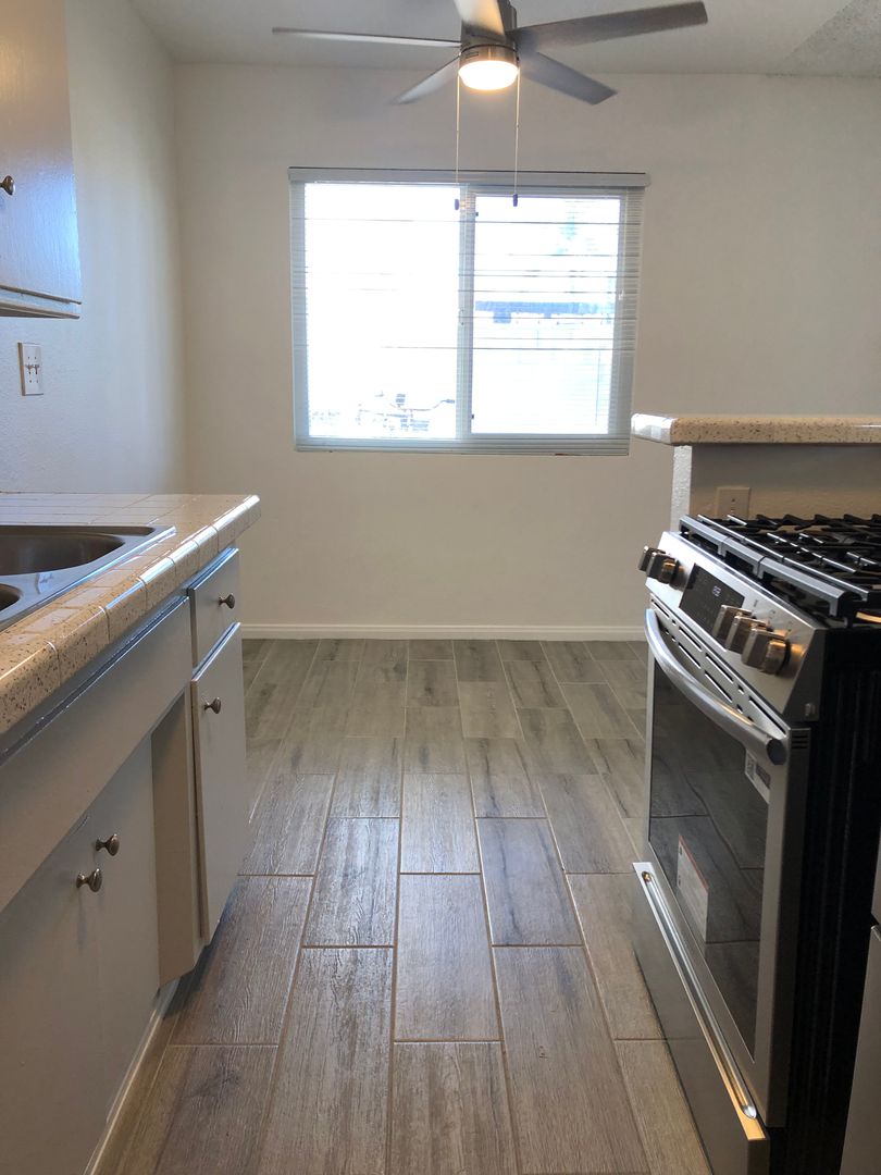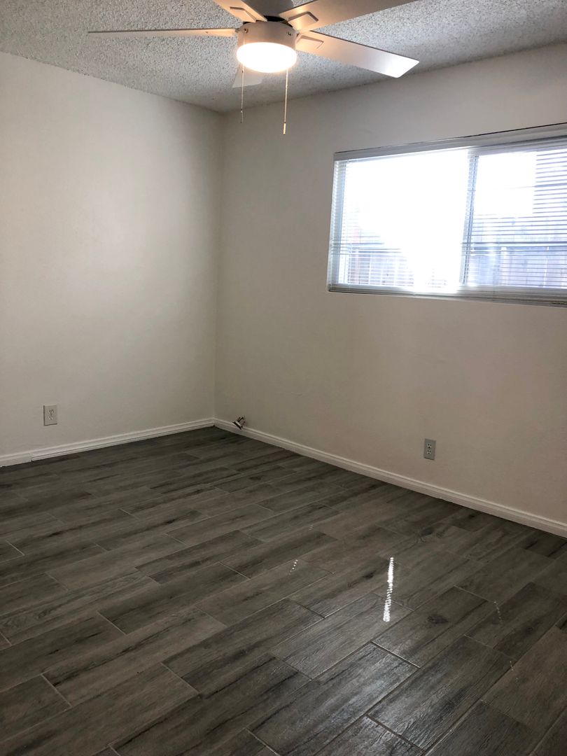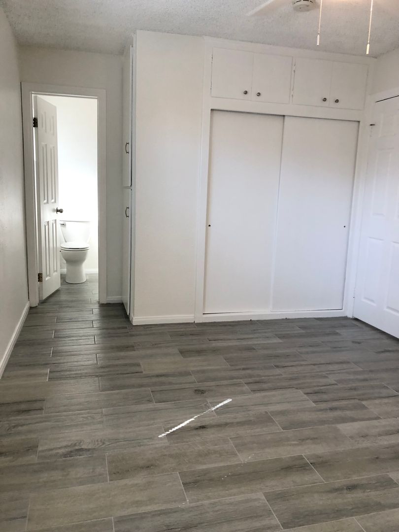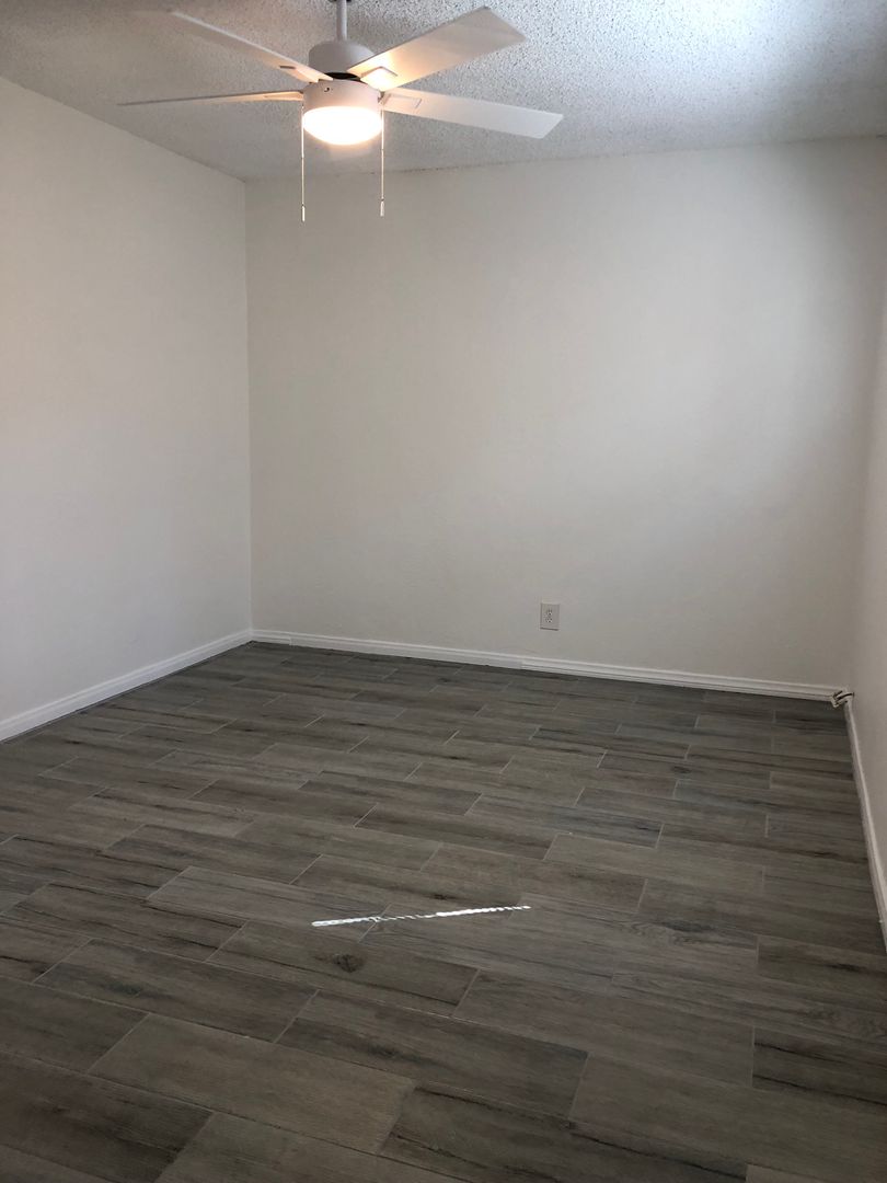 Wood planked tile flooring throughout with new paint.